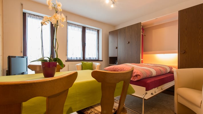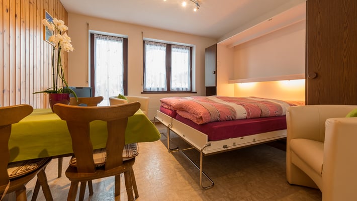 Die 1.5-Zimmer-Ferienwohnung im Haus Orphelja liegt im Erdgeschoss und bietet Ihnen alles, was Sie für eine erholsame Auszeit zu zweit brauchen: eine ruhige Lage mit Blick auf die Berge, ein komfortables Klappbett für erholsamen Schlaf, eine gut ausgestattete Küche sowie ein heller Essbereich mit direktem Zugang zum grossen Rasenvorplatz. Ob für ein verlängertes Wochenende oder einen längeren Aufenthalt – hier geniessen Sie Ruhe, Privatsphäre und die Nähe zur Natur. Die Hohsaas-Bergbahnen erreichen Sie in nur 12 Minuten zu Fuss, Saas-Fee in knapp 20 Minuten mit dem Bus. Ideal für Paare, die Wert auf Einfachheit, Atmosphäre und eine liebevoll eingerichtete Unterkunft legen.